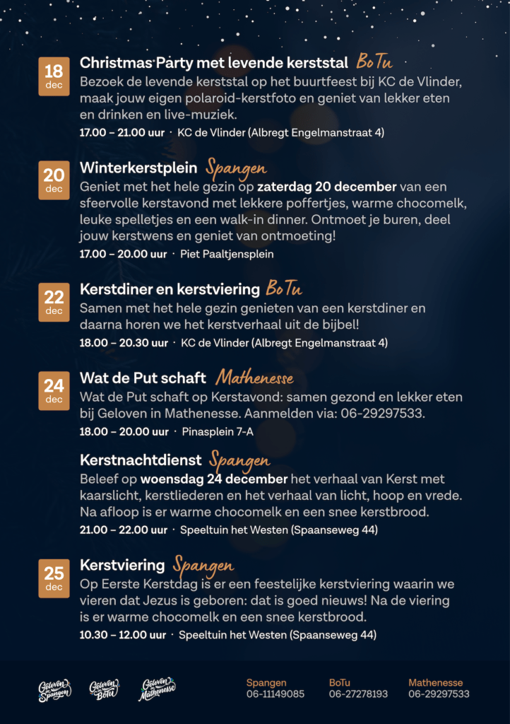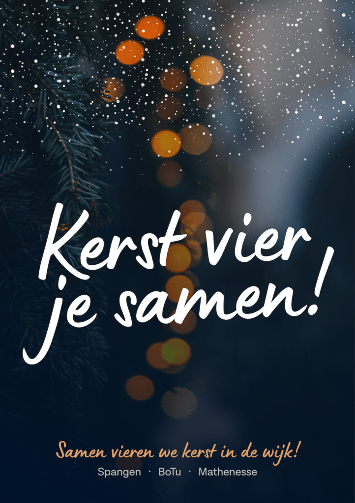 Hier vind je een overzicht van de activiteiten rond Kerst in de decembermaand in Spangen, BoTu en Mathenesse. Waar zien we jou?